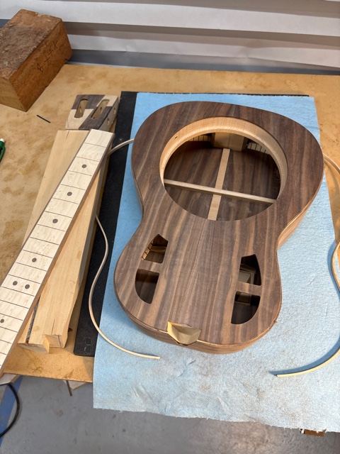 clean up body, rout dovetail, drill tuner holes, glue fretboard onto neck, rout binding channels, glue in top binding