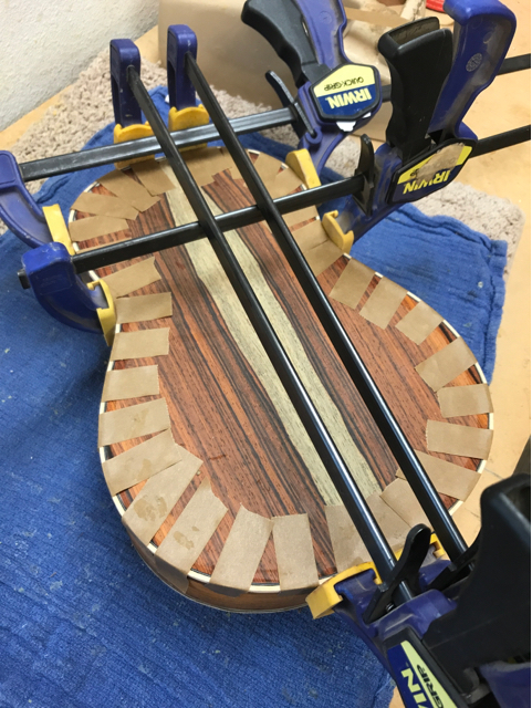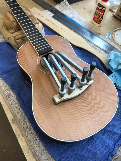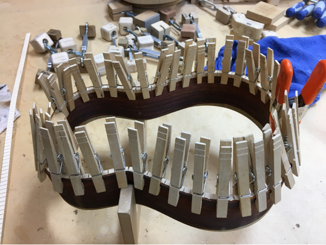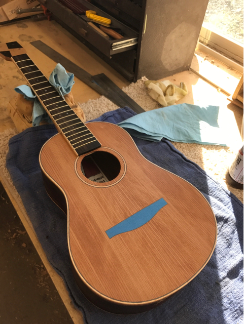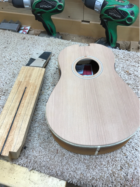 clean up body, rout dovetail, drill tuner holes, glue fretboard onto neck, rout binding channels, glue in top binding