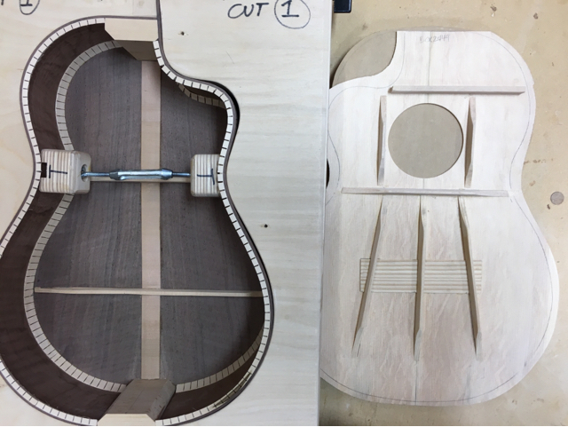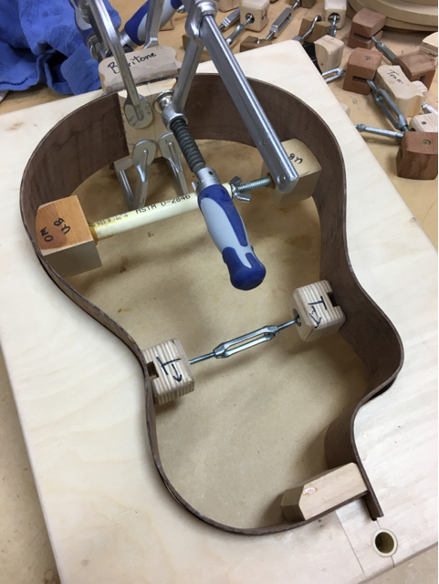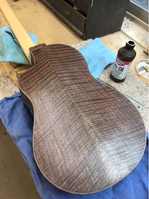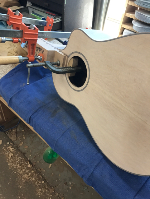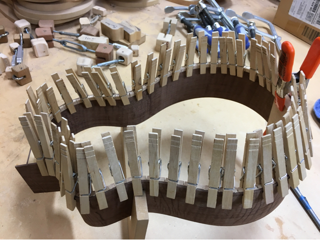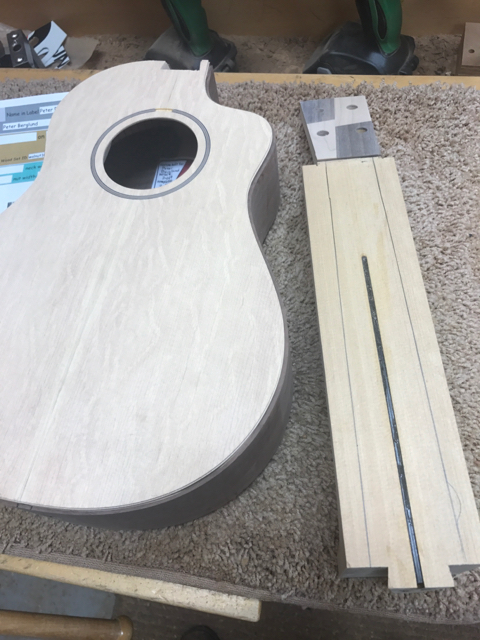 clean up body, rout dovetail, drill tuner holes, glue fretboard onto neck, rout binding channels, glue in top binding