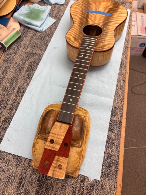 shape neck, dress fret ends, glue in back binding