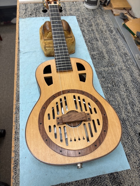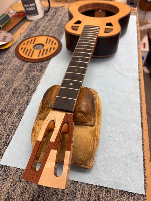 clean up body, rout dovetail, drill tuner holes, glue fretboard onto neck, rout binding channels, glue in top binding |