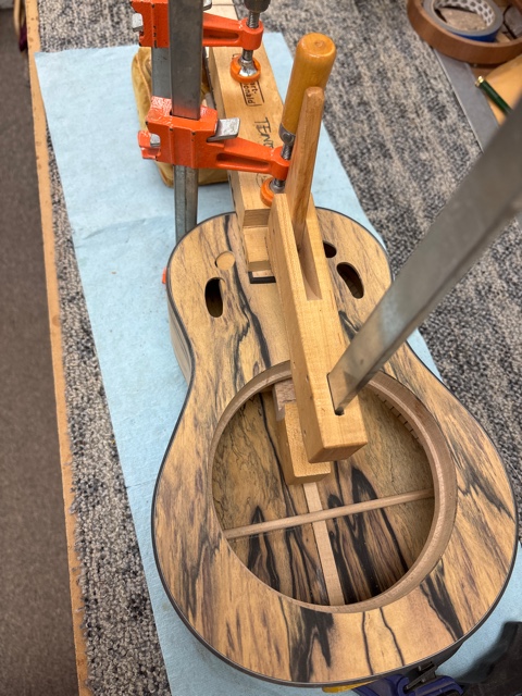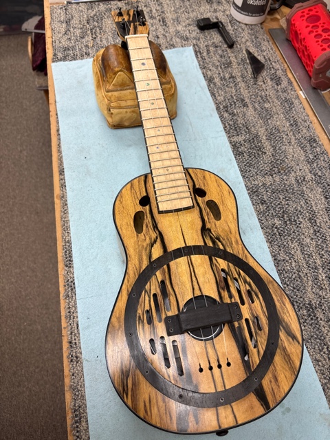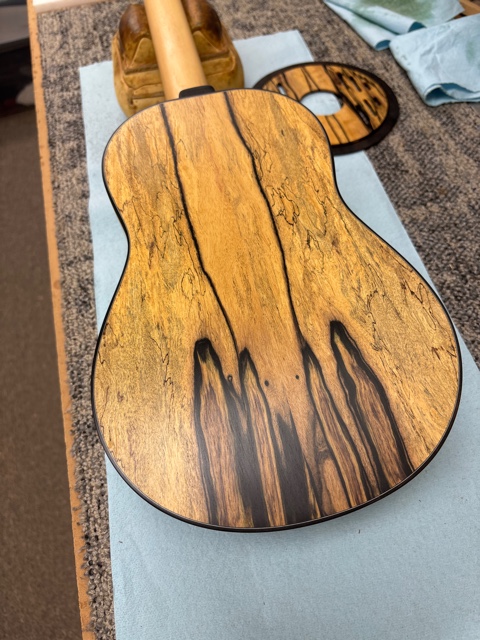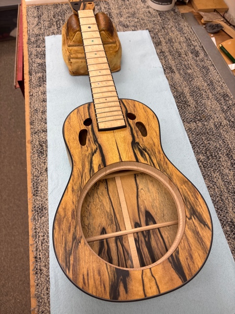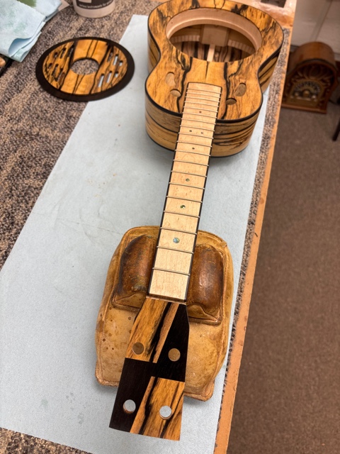 clean up body, rout dovetail, drill tuner holes, glue fretboard onto neck, rout binding channels, glue in top binding