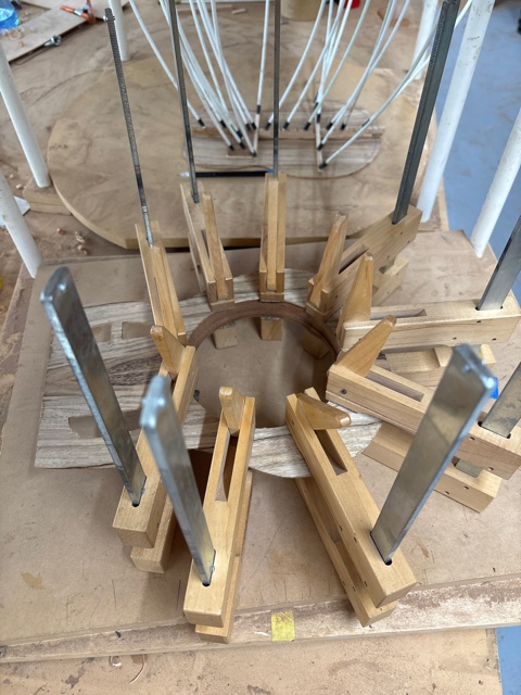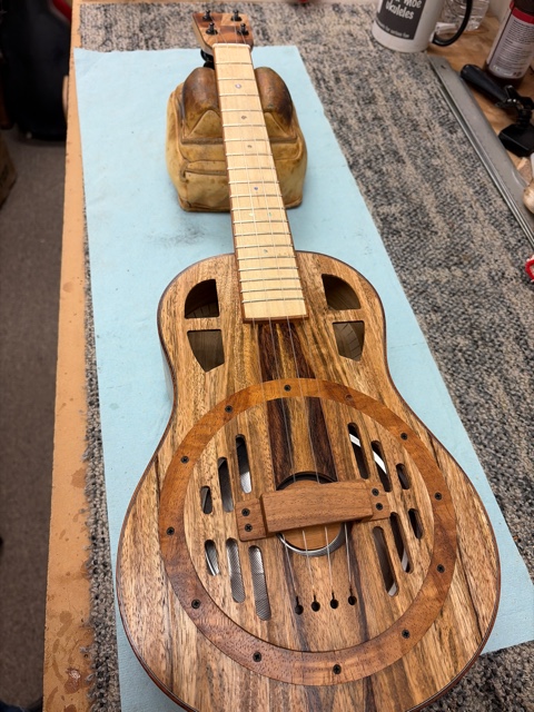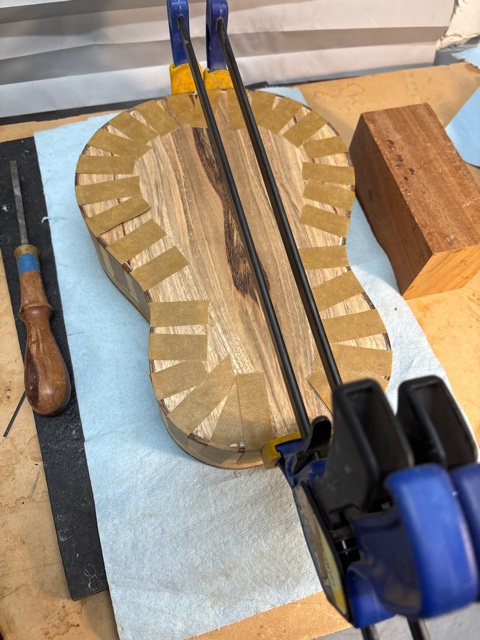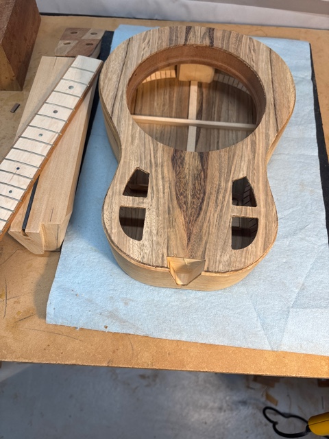 clean up body, rout dovetail, drill tuner holes, glue fretboard onto neck, rout binding channels, glue in top binding |
