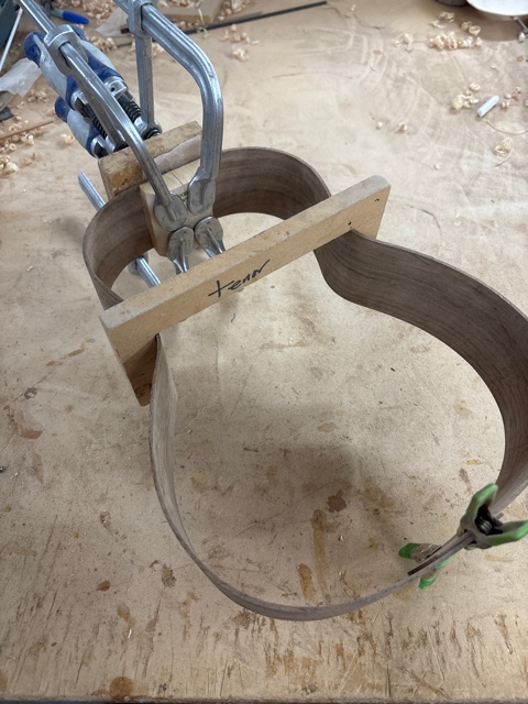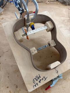 clean up body, rout dovetail, drill tuner holes, glue fretboard onto neck, rout binding channels, glue in top binding |