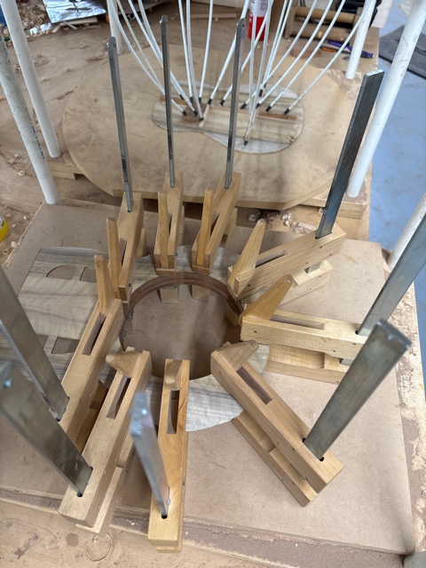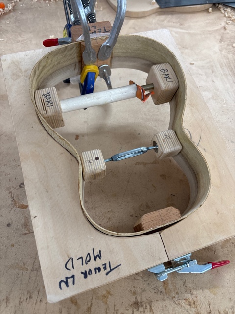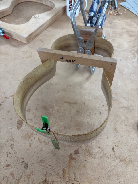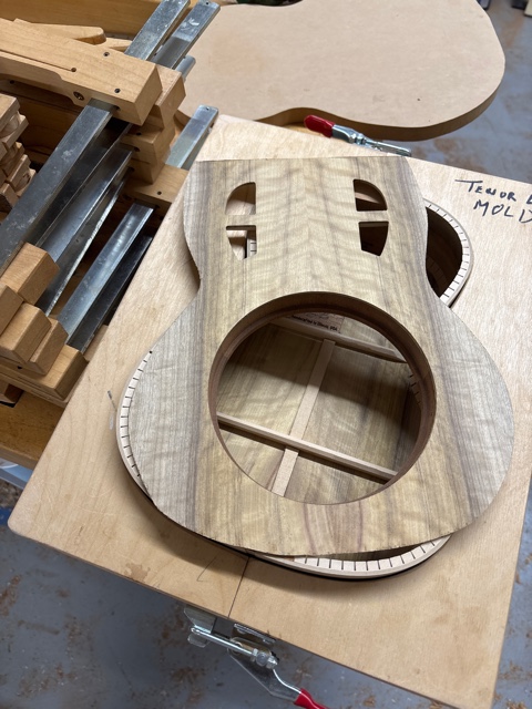 clean up body, rout dovetail, drill tuner holes, glue fretboard onto neck, rout binding channels, glue in top binding |