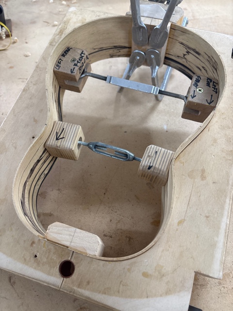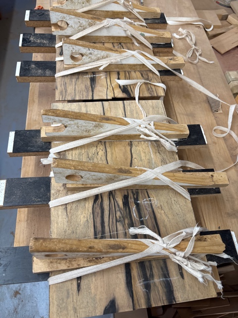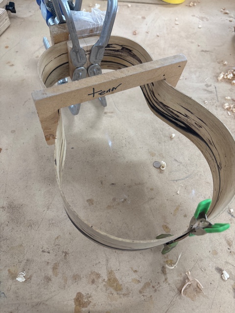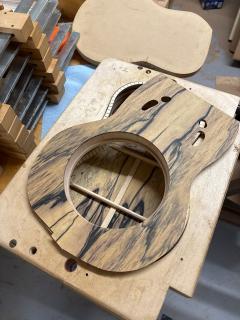 clean up body, rout dovetail, drill tuner holes, glue fretboard onto neck, rout binding channels, glue in top binding |