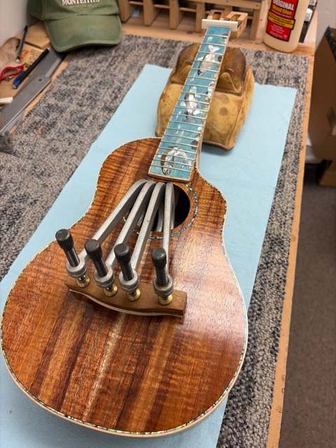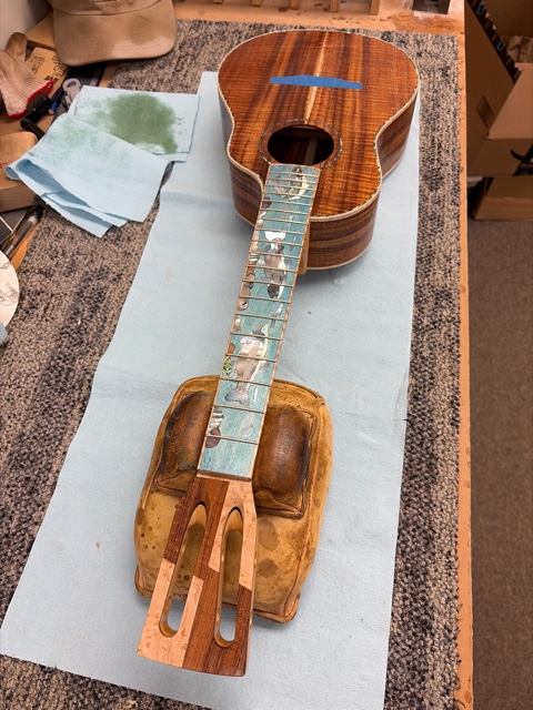 clean up body, rout dovetail, drill tuner holes, glue fretboard onto neck, rout binding channels, glue in top binding