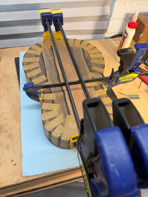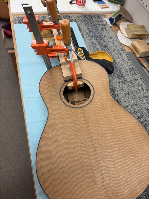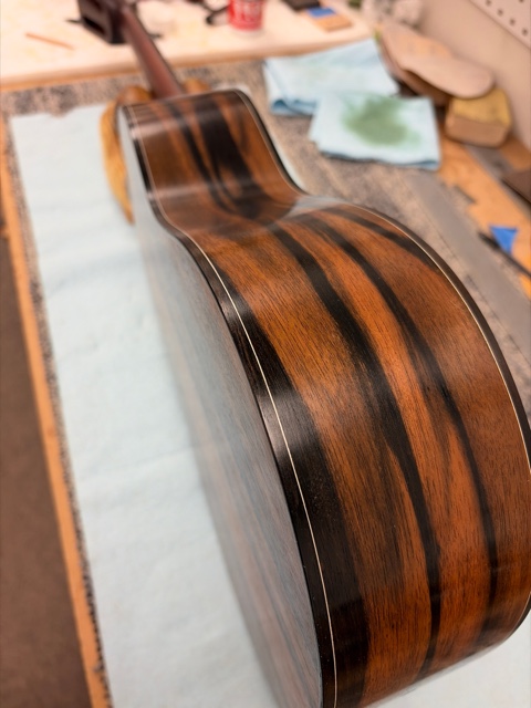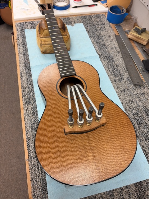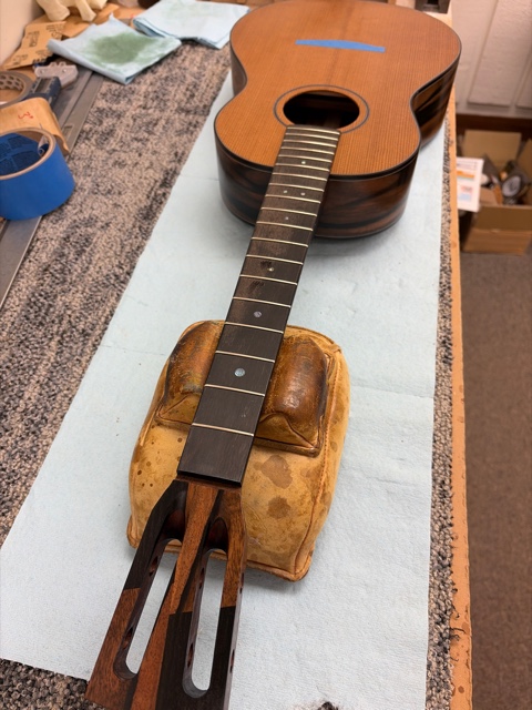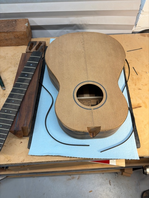 clean up body, rout dovetail, drill tuner holes, glue fretboard onto neck, rout binding channels, glue in top binding