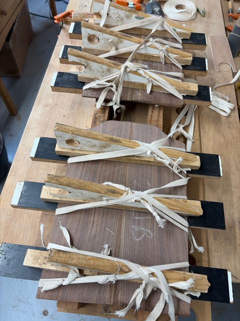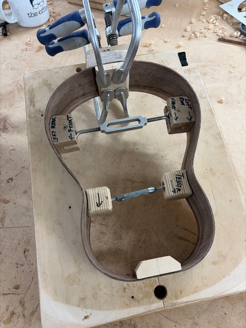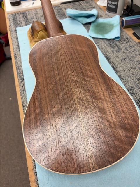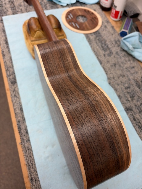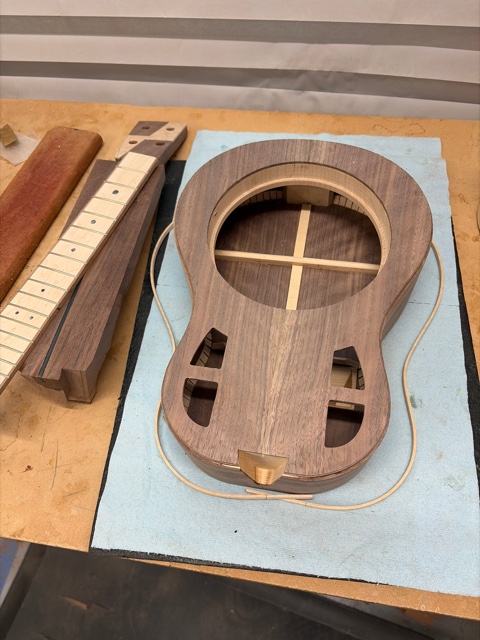 clean up body, rout dovetail, drill tuner holes, glue fretboard onto neck, rout binding channels, glue in top binding |