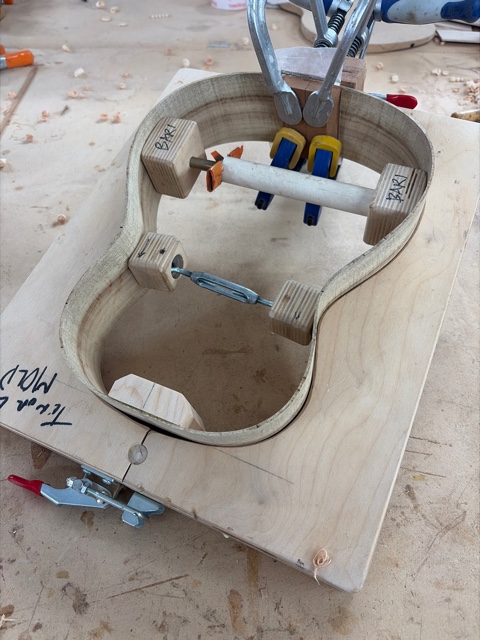 clean up body, rout dovetail, drill tuner holes, glue fretboard onto neck, rout binding channels, glue in top binding |
