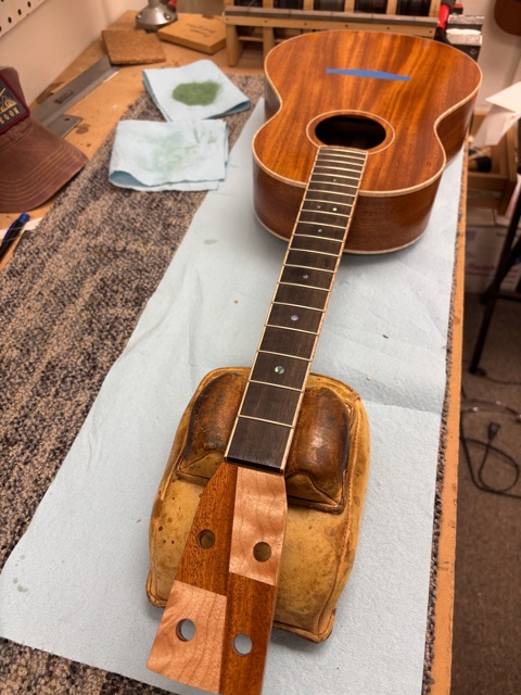 shape neck, dress fret ends, glue in back binding